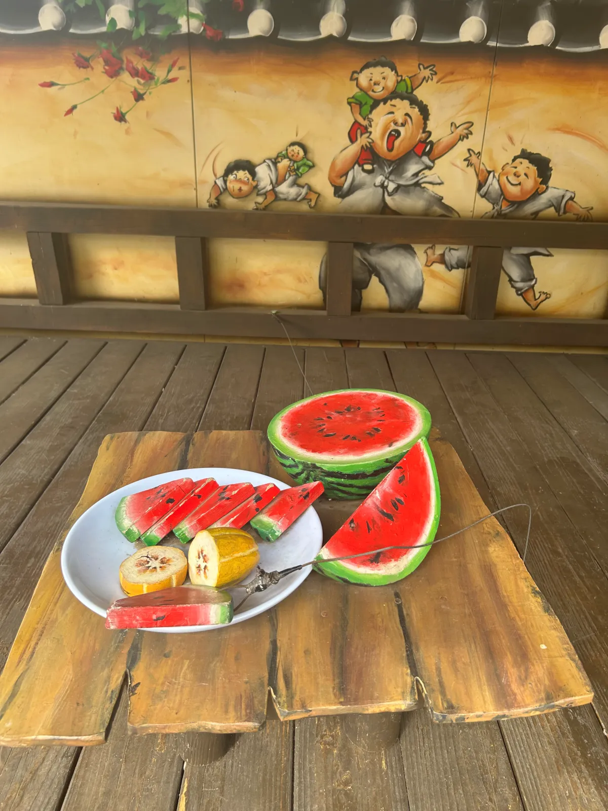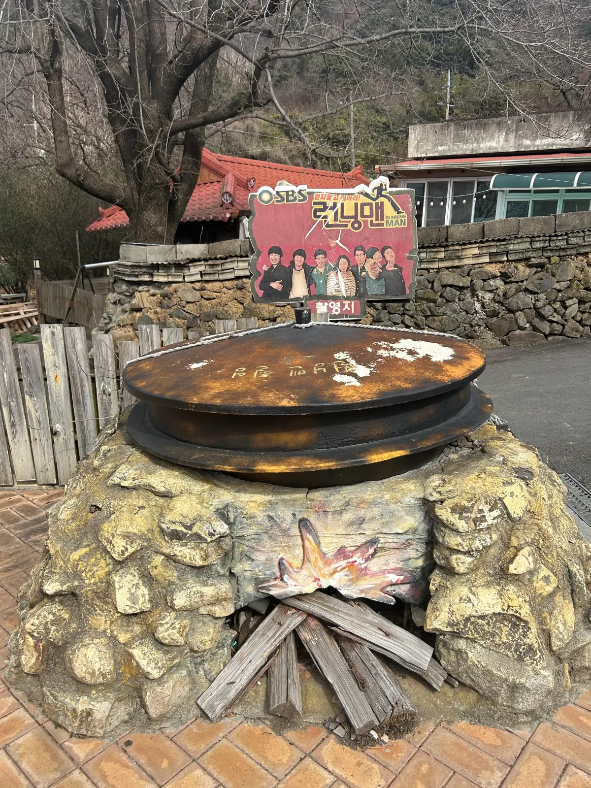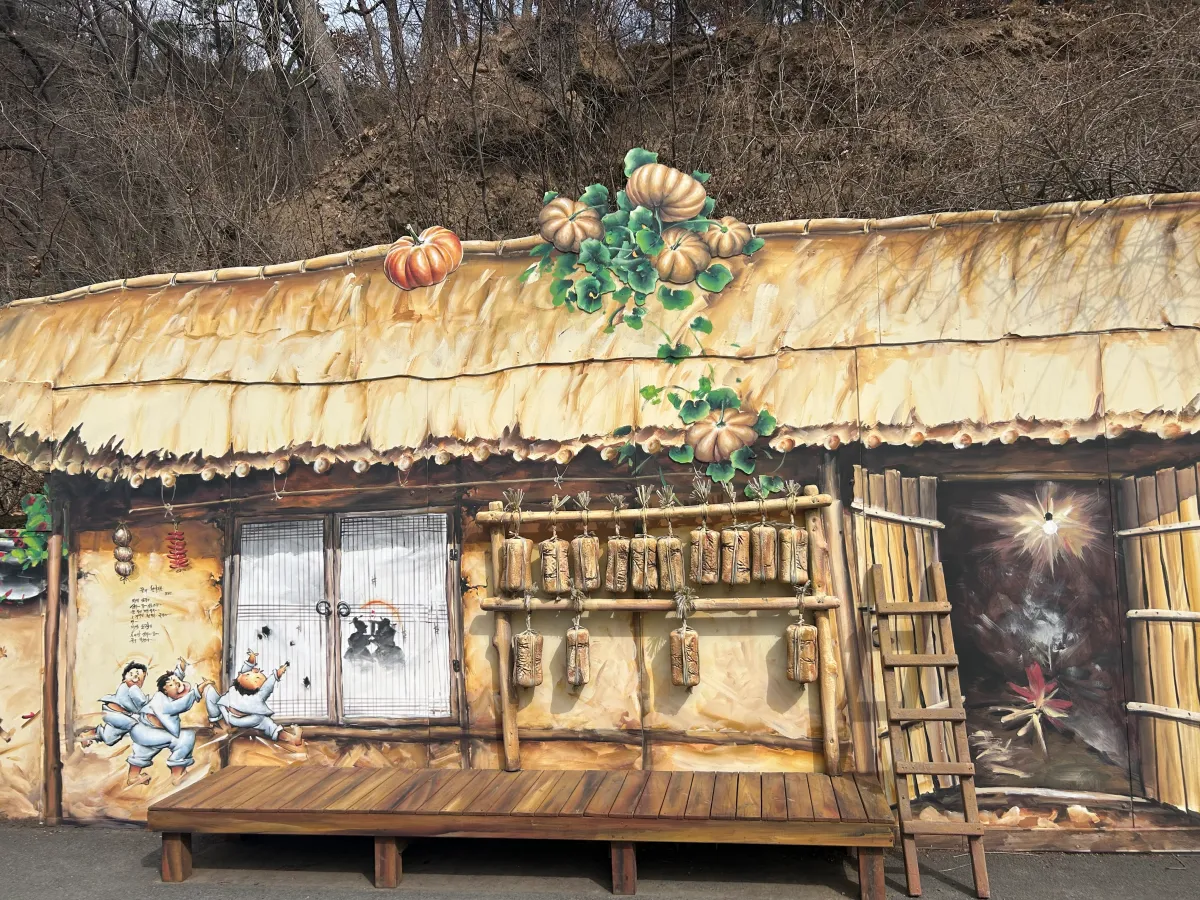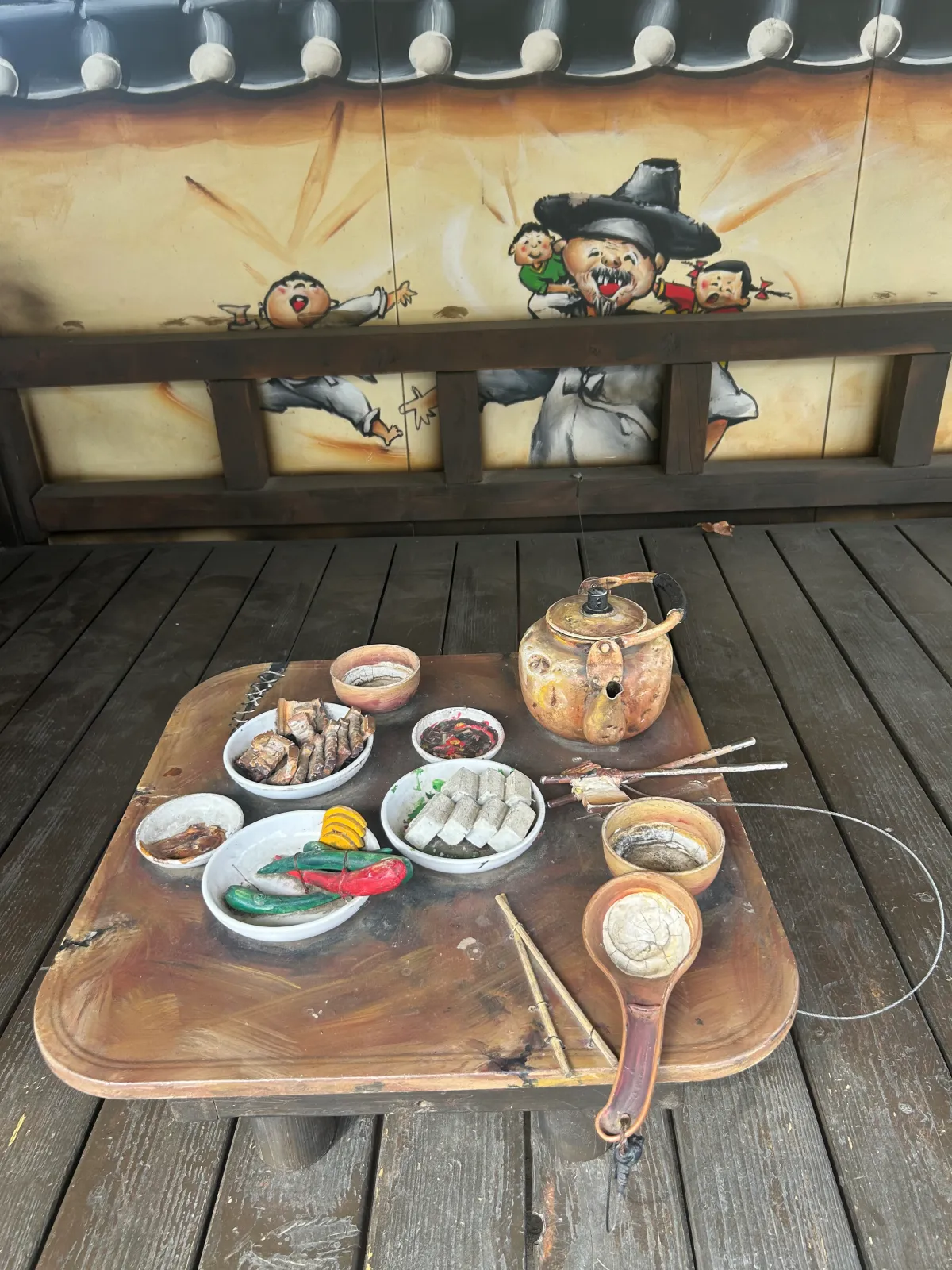 쭉 내려오다 보면 정자가 두 군대 있는 게 거기에 술상과 다과상이 차려져 있어요.ㅋㅋ 포토존으로 만들어 놓은 공간인데 리얼하게 만들어서 보는 재미가 있더라고요. 앞에 커란 건물 농촌체험전시장이 보여요. 바닥엔 땅따먹기도 그려져 있고 예전에 런닝맨이 와서 촬영했던 대형 가마솥이 있더라구요.