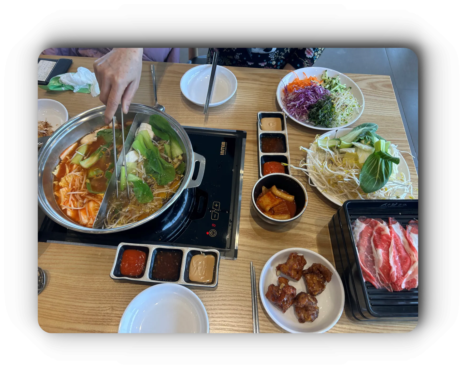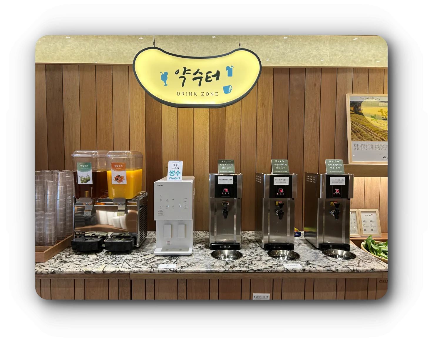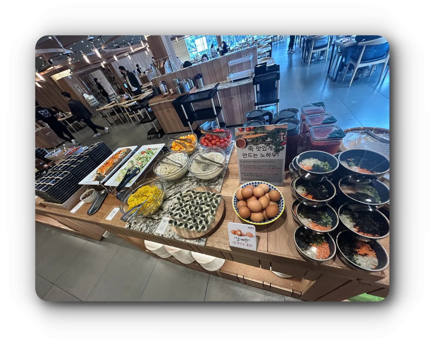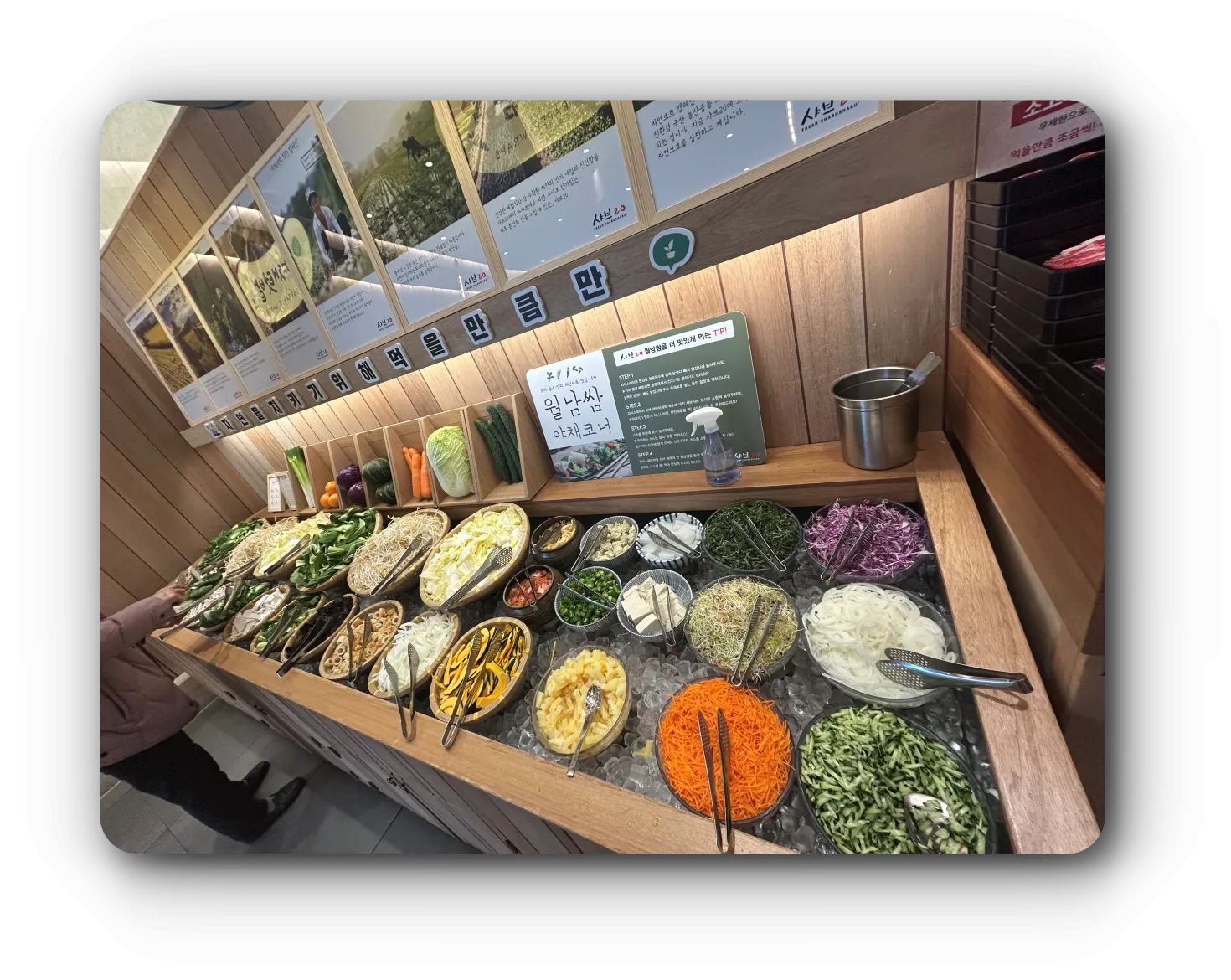 - 육수가 끓는 동안 샐러드바에서 사이드 메뉴들을 담아 와요