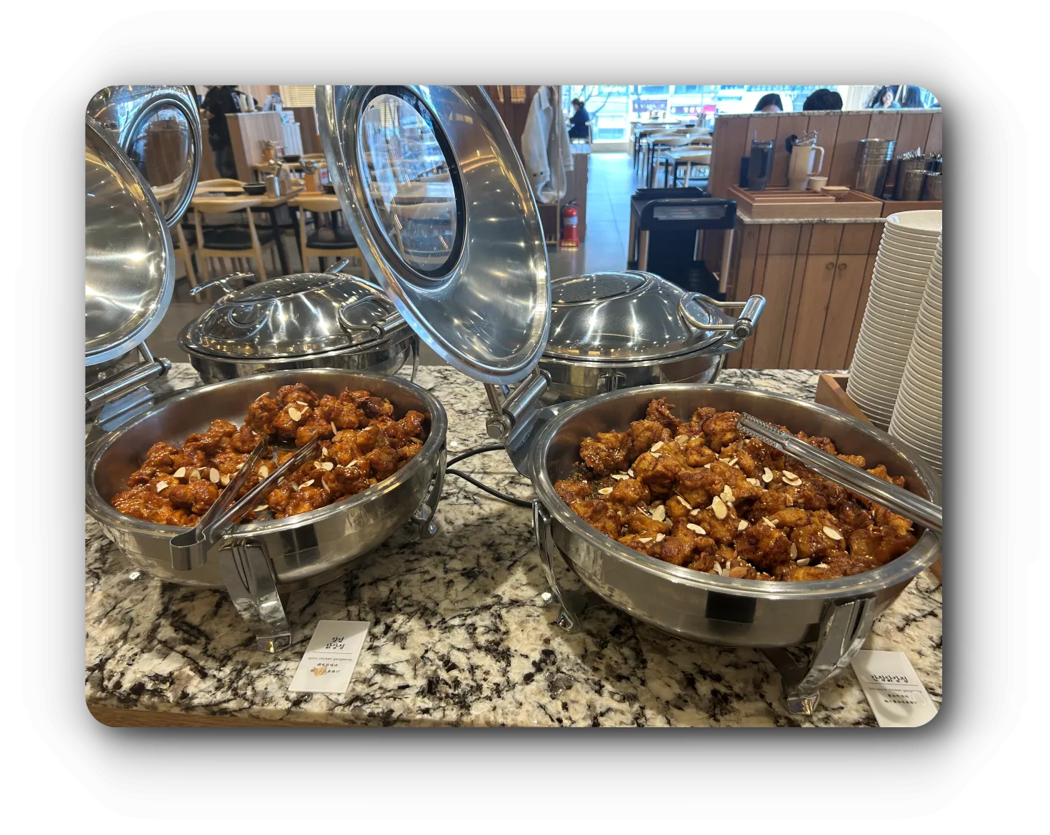 며칠 전 예식장 뷔페를 갔었는데 진짜 최악이었거든요. 사람은 엄청 많은데 음식은 한 곳에만 몰아져 있어서 대기줄이 구불구불 정말...ㅜㅜ 여태 갔던 예식장 뷔페시설 중 최악이었어요. 거기에 비해서 그런지 여기는 정말 좋더라고요^^