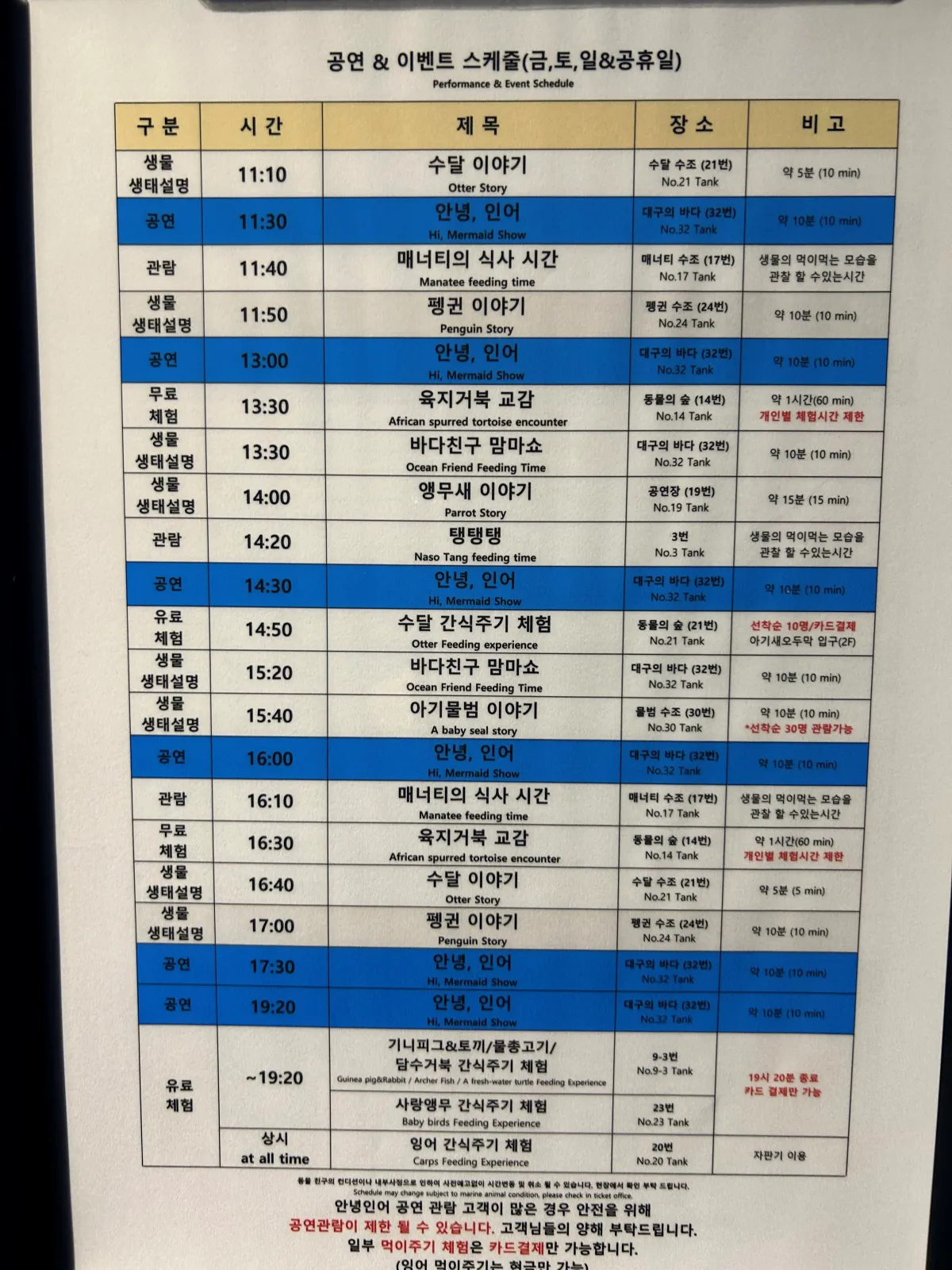 시간 맞춰서 가시면 저희처럼 뒤에서 서서 볼 수 있어요. 준비되어 있는 방석이 있어서 미리 자리를 맡고 앉아 계시는 분들이 많았어요. 아쿠아리움 안에 앉아서 쉴 수 있는 공간이 별로 없어서 여기서 쉬면서 기다리는 것도 나쁘지 않은 거 같아요. 여수나 제주 아쿠아리움은 안에 카페도 있었던 거 같은데 여긴 자판기가 다 더라고요. 그게 좀 아쉽긴 했어요.