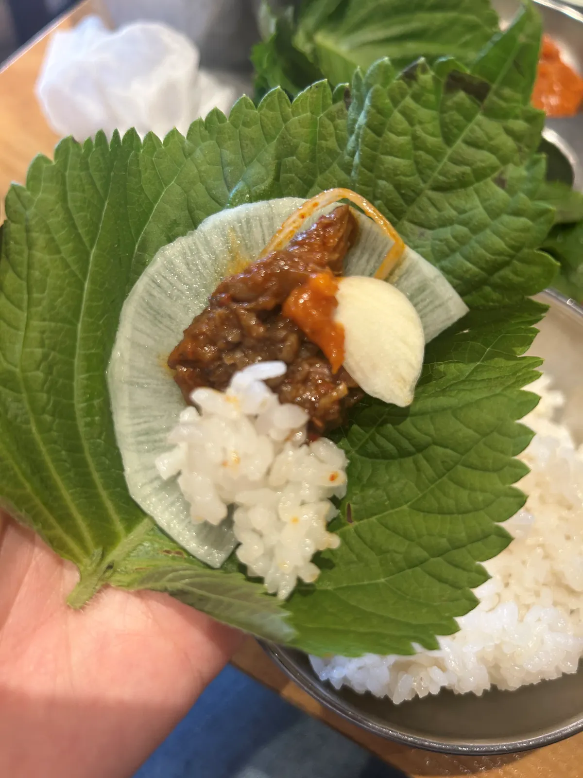 - 깻잎 →쌈무→고기 듬뿍 → 쌈장 찍은 마늘 →밥 순서로 쌈을 싸서 먹기