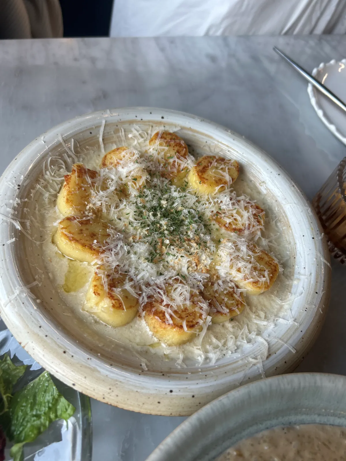 뇨끼는 말 만들었지 직접 먹는 건 처음이었는데요. 굉장히 부드러웠어요. 한입 베어 물면 근데 이상한 특유의 향이 훅 들어오더라고요. 뇨끼가 원래 그런가요? 냉동인 건가? 치즈냄새인 건가? 제겐 좋은 향은 아니었어요. 하얀 크림과 치즈가루가 뇨끼의 식감을 더 부드럽게 만들어 줬어요. 호불호 없이 좋아하시는 메뉴였어요.
