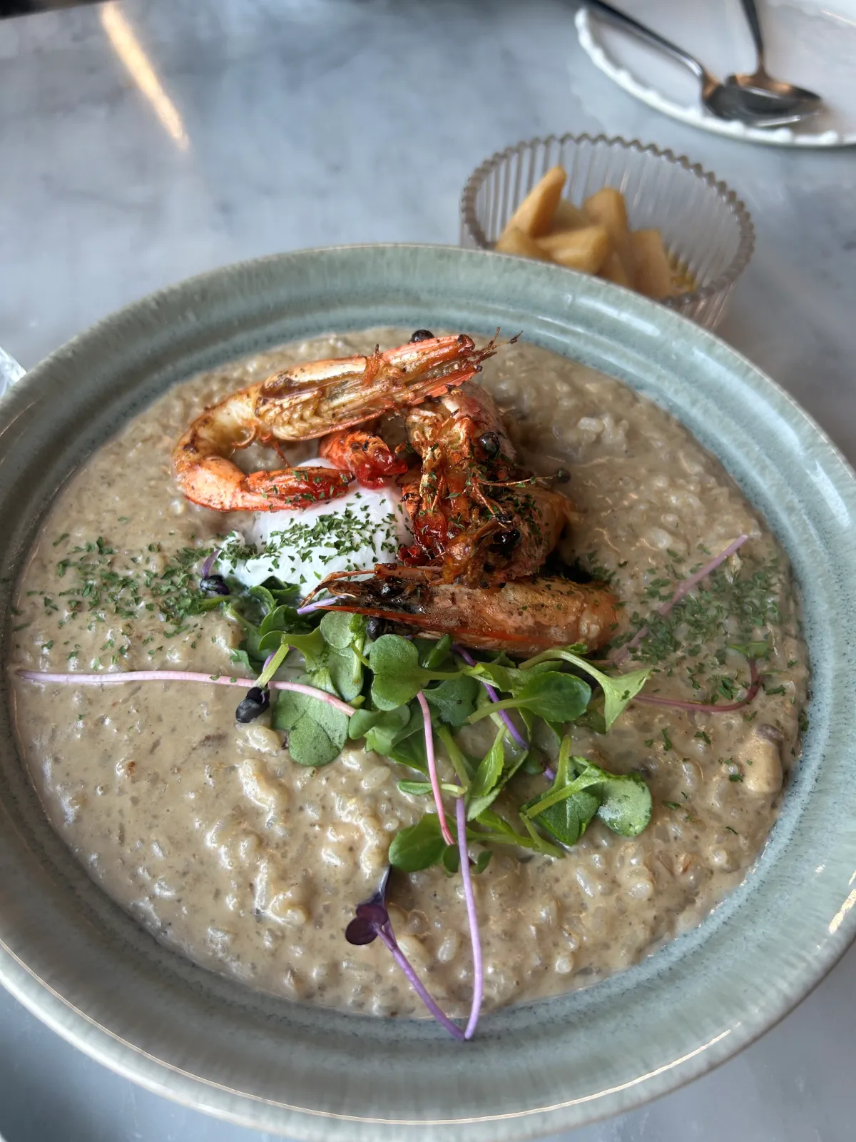 게장 리조토도 많이들 드시는 메뉴더라고요. 여기서 셰프님의 센스가 너무 돋보였던 게 새우튀김이 4개가 올라가 있어요. 바로바로 인원수 대로 주신 거죠. 세프님의 센스에 감동했답니다.