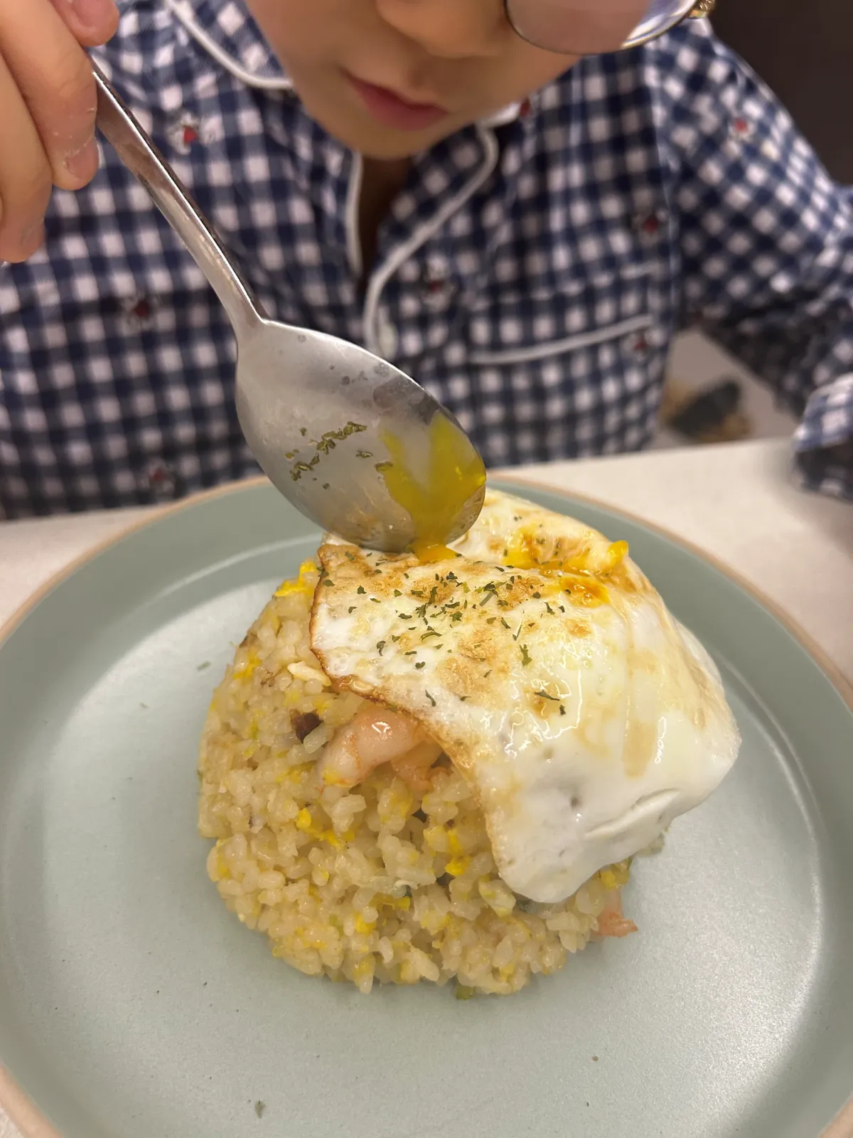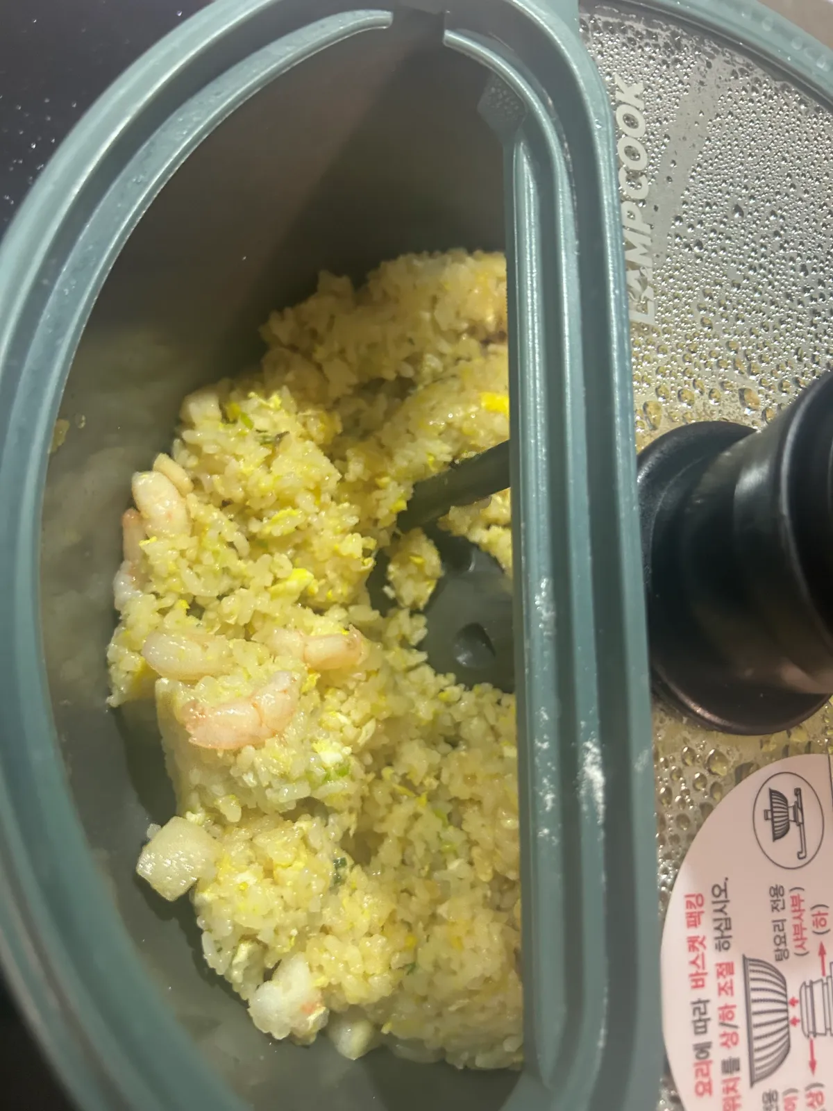 먼저 기름을 넣고 다진 야채와 새우, 밥 넣어 회전 그릴 돌려주면 앞에 서서 계속 저어줄 필요 없어요